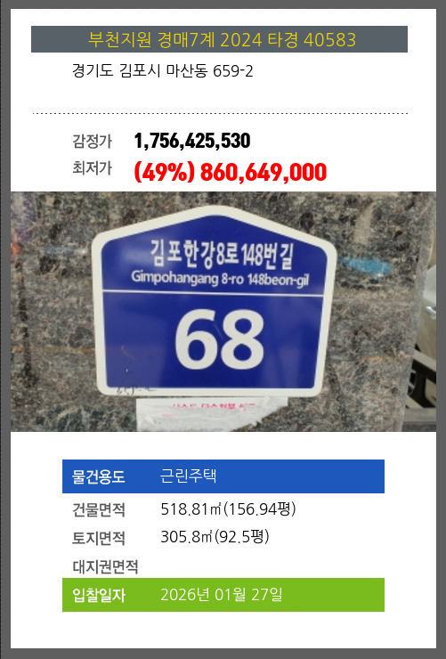사건번호 2024 타경 40583 본건은 경기도 김포시 마산동 659-2소재하는 근린주택경매 물건의 포스팅입니다. 건물면적 [ 518.81㎡ (156.94평) ]토지면적 [ 305.8㎡ (92.5평) ] 시세를 반영한 감정가 1,756,425,530에서2회