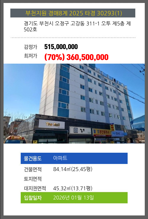 사건번호 2025 타경 30293(1) 본건은 경기도 부천시 오정구 고강동 311-1 오투 제5층 제502호소재하는 아파트경매 물건의 포스팅입니다. 건물면적 [ 84.14㎡ (25.45평) ]대지권 [ 45.32㎡ (13.71평) ]