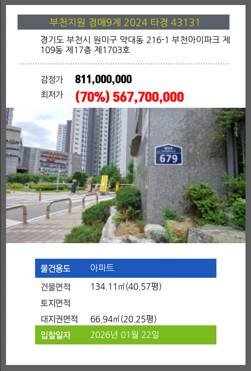 사건번호 2024 타경 43131 본건은 경기도 부천시 원미구 약대동 216-1 부천아이파크 제109동 제17층 제1703호소재하는 아파트경매 물건의 포스팅입니다. 건물면적 [ 134.11㎡ (40.57평) ]대지권 [ 66.94㎡ (20.25평)