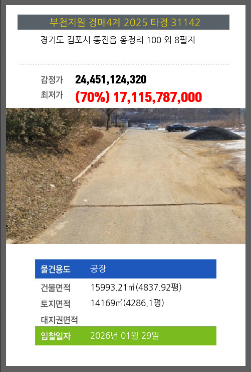 사건번호 2025 타경 31142 본건은 경기도 김포시 통진읍 옹정리 100 외 8필지소재하는 공장경매 물건의 포스팅입니다. 건물면적 [ 15993.21㎡ (4837.92평) ]토지면적 [ 14169㎡ (4286.1평) ] 시세를