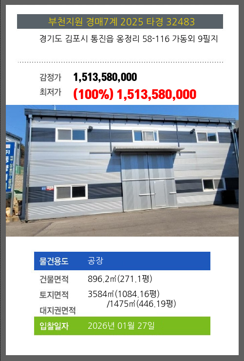 사건번호 2025 타경 32483 본건은 경기도 김포시 통진읍 옹정리 58-116 가동외 9필지소재하는 공장경매 물건의 포스팅입니다. 건물면적 [ 896.2㎡ (271.1평) ]토지면적 [ 전체:3584㎡ (1084.16평) 매각지분:1475㎡ (446.19평)