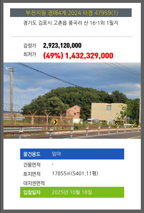 사건번호 2024 타경 47959(1) 본건은 경기도 김포시 고촌읍 풍곡리 산 16-1외 1필지소재하는 임야경매 물건의 포스팅입니다. 토지면적 [ 17855㎡ (5401.11평) ] 시세를 반영한 감정가 2,923,120,000에서3회 유찰되어