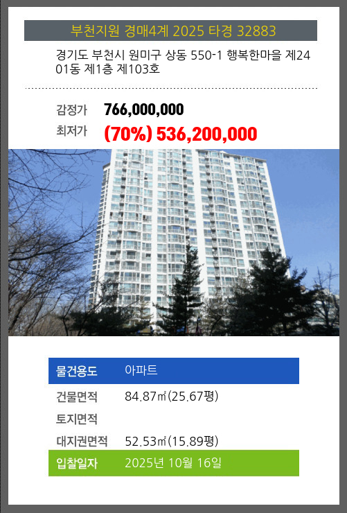 사건번호 2025 타경 32883 본건은 경기도 부천시 원미구 상동 550-1 행복한마을 제2401동 제1층 제103호소재하는 아파트경매 물건의 포스팅입니다. 건물면적 [ 84.87㎡ (25.67평) ]대지권 [ 52.53㎡ (15.89평)