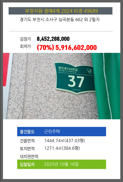 사건번호 2024 타경 49689 본건은 경기도 부천시 소사구 심곡본동 662 외 2필지소재하는 근린주택경매 물건의 포스팅입니다. 건물면적 [ 1444.74㎡ (437.03평) ]토지면적 [ 1271.4㎡ (384.6평) ] 시세를