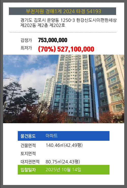 사건번호 2024 타경 54193 본건은 경기도 김포시 운양동 1250-3 한강신도시이편한세상 제202동 제2층 제202호소재하는 아파트경매 물건의 포스팅입니다. 건물면적 [ 140.46㎡ (42.49평) ]대지권 [ 80.75㎡ (24.43평) ]