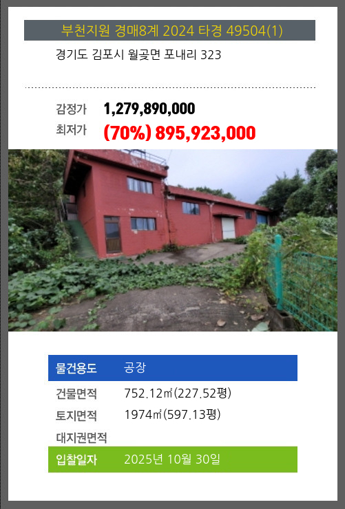 사건번호 2024 타경 49504(1) 본건은 경기도 김포시 월곶면 포내리 323소재하는 공장경매 물건의 포스팅입니다. 건물면적 [ 752.12㎡ (227.52평) ]토지면적 [ 1974㎡ (597.13평) ] 시세를 반영한 감정가