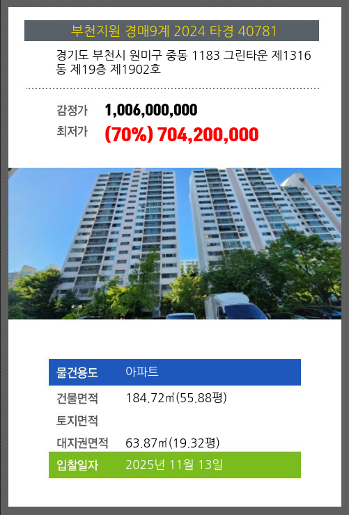 사건번호 2024 타경 40781 본건은 경기도 부천시 원미구 중동 1183 그린타운 제1316동 제19층 제1902호소재하는 아파트경매 물건의 포스팅입니다. 건물면적 [ 184.72㎡ (55.88평) ]대지권 [ 63.87㎡ (19.32평)