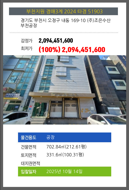 사건번호 2024 타경 51903 본건은 경기도 부천시 오정구 내동 169-10 (주)조은수산 부천공장소재하는 공장경매 물건의 포스팅입니다. 건물면적 [ 702.84㎡ (212.61평) ]토지면적 [ 331.6㎡ (100.31평) ] 시세를