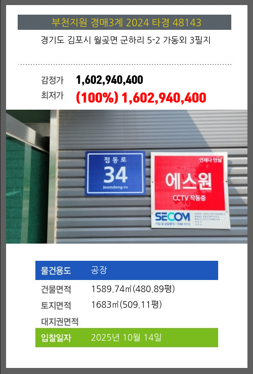사건번호 2024 타경 48143 본건은 경기도 김포시 월곶면 군하리 5-2 가동외 3필지소재하는 공장경매 물건의 포스팅입니다. 건물면적 [ 1589.74㎡ (480.89평) ]토지면적 [ 1683㎡ (509.11평) ] 시세를
