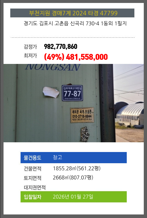 사건번호 2024 타경 47799 본건은 경기도 김포시 고촌읍 신곡리 730-4 1동외 1필지소재하는 창고경매 물건의 포스팅입니다. 건물면적 [ 1855.28㎡ (561.22평) ]토지면적 [ 2668㎡ (807.07평) ] 시세를