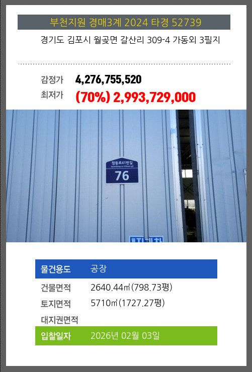 사건번호 2024 타경 52739 본건은 경기도 김포시 월곶면 갈산리 309-4 가동외 3필지소재하는 공장경매 물건의 포스팅입니다. 건물면적 [ 2640.44㎡ (798.73평) ]토지면적 [ 5710㎡ (1727.27평) ] 시세를