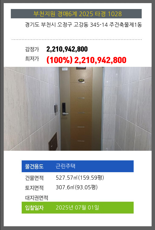 사건번호 2025 타경 1028 본건은 경기도 부천시 오정구 고강동 345-14 주건축물제1동소재하는 근린주택경매 물건의 포스팅입니다. 건물면적 [ 527.57㎡ (159.59평) ]토지면적 [ 307.6㎡ (93.05평) ] 시세를 반영한