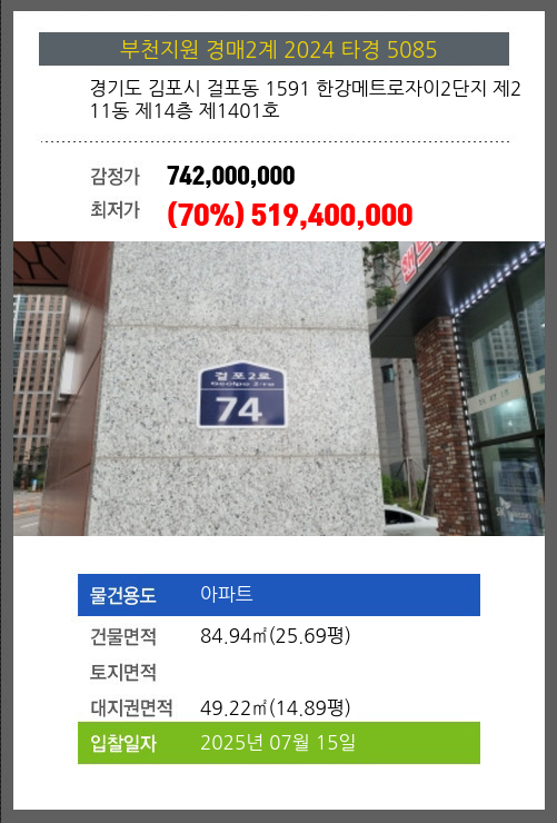 사건번호 2024 타경 5085 본건은 경기도 김포시 걸포동 1591 한강메트로자이2단지 제211동 제14층 제1401호소재하는 아파트경매 물건의 포스팅입니다. 건물면적 [ 84.94㎡ (25.69평) ]대지권 [ 49.22㎡ (14.89평) ]