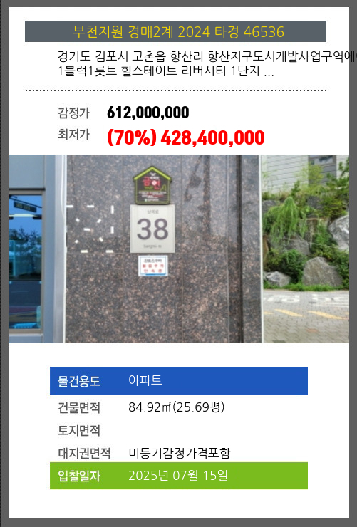 사건번호 2024 타경 46536 본건은 경기도 김포시 고촌읍 향산리 향산지구도시개발사업구역에이1블럭1롯트 힐스테이트 리버시티 1단지 …소재하는 아파트경매 물건의 포스팅입니다. 건물면적 [ 84.92㎡ (25.69평) ]대지권 [ 미등기감정가격포함 ]