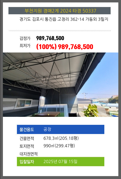 사건번호 2024 타경 50337 본건은 경기도 김포시 통진읍 고정리 362-14 가동외 3필지소재하는 공장경매 물건의 포스팅입니다. 건물면적 [ 678.3㎡ (205.18평) ]토지면적 [ 990㎡ (299.47평) ] 시세를