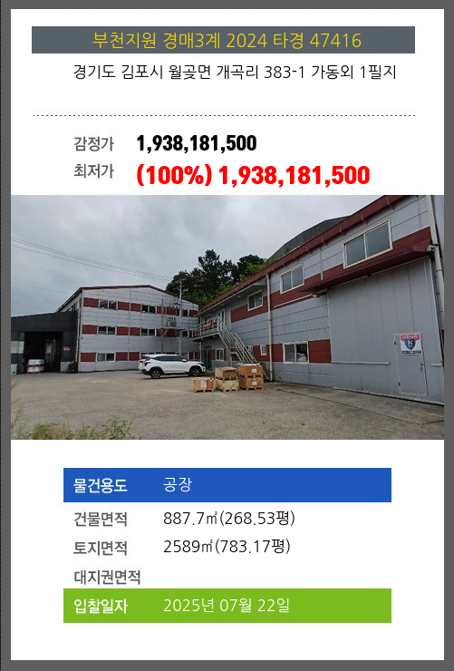 사건번호 2024 타경 47416 본건은 경기도 김포시 월곶면 개곡리 383-1 가동외 1필지소재하는 공장경매 물건의 포스팅입니다. 건물면적 [ 887.7㎡ (268.53평) ]토지면적 [ 2589㎡ (783.17평) ] 시세를