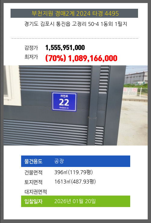 사건번호 2024 타경 4495 본건은 경기도 김포시 통진읍 고정리 50-4 1동외 1필지소재하는 공장경매 물건의 포스팅입니다. 건물면적 [ 396㎡ (119.79평) ]토지면적 [ 1613㎡ (487.93평) ] 시세를