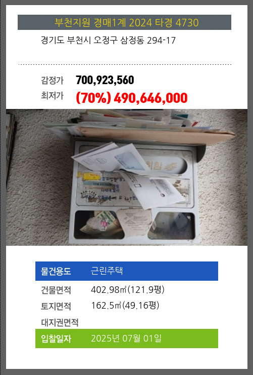 사건번호 2024 타경 4730 본건은 경기도 부천시 오정구 삼정동 294-17소재하는 근린주택경매 물건의 포스팅입니다. 건물면적 [ 402.98㎡ (121.9평) ]토지면적 [ 162.5㎡ (49.16평) ] 시세를 반영한 감정가