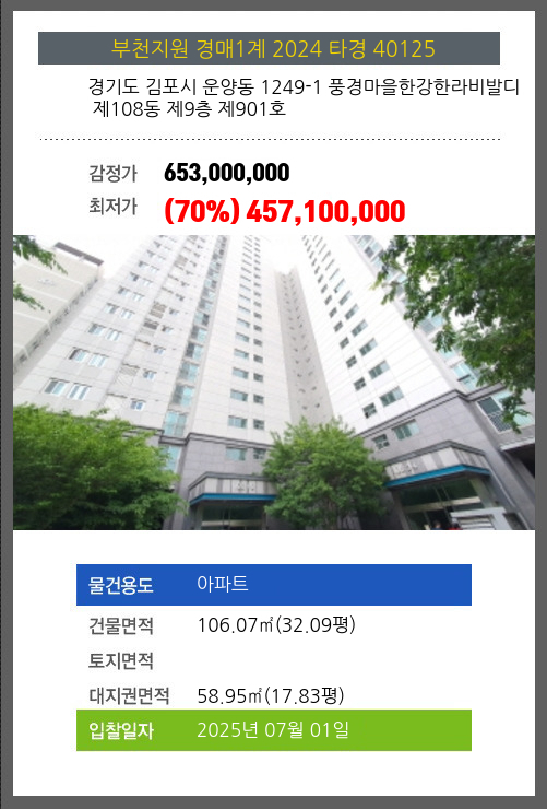 사건번호 2024 타경 40125 본건은 경기도 김포시 운양동 1249-1 풍경마을한강한라비발디 제108동 제9층 제901호소재하는 아파트경매 물건의 포스팅입니다. 건물면적 [ 106.07㎡ (32.09평) ]대지권 [ 58.95㎡ (17.83평) ]