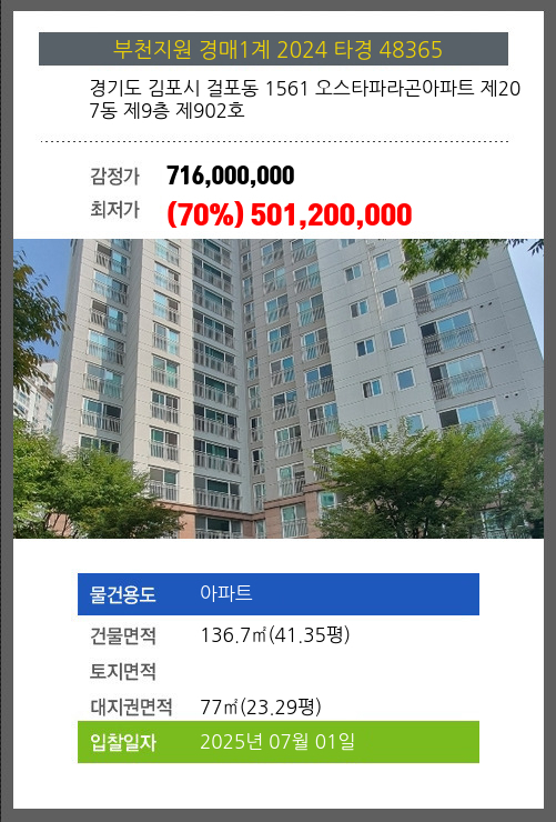 사건번호 2024 타경 48365 본건은 경기도 김포시 걸포동 1561 오스타파라곤아파트 제207동 제9층 제902호소재하는 아파트경매 물건의 포스팅입니다. 건물면적 [ 136.7㎡ (41.35평) ]대지권 [ 77㎡ (23.29평) ]
