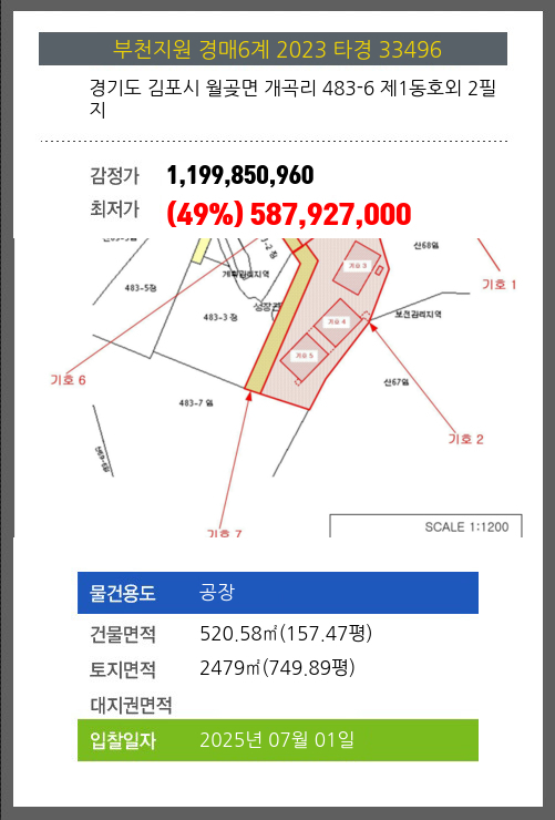사건번호 2023 타경 33496 본건은 경기도 김포시 월곶면 개곡리 483-6 제1동호외 2필지소재하는 공장경매 물건의 포스팅입니다. 건물면적 [ 520.58㎡ (157.47평) ]토지면적 [ 2479㎡ (749.89평) ] 시세를