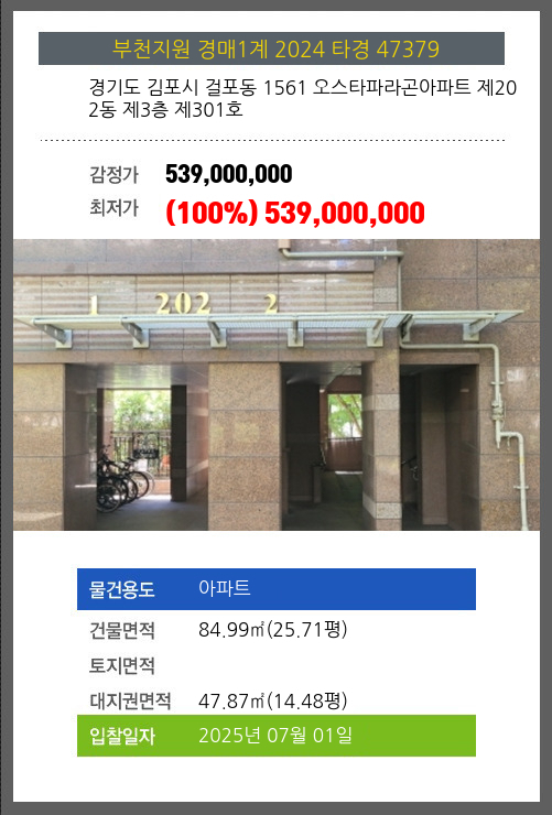 사건번호 2024 타경 47379 본건은 경기도 김포시 걸포동 1561 오스타파라곤아파트 제202동 제3층 제301호소재하는 아파트경매 물건의 포스팅입니다. 건물면적 [ 84.99㎡ (25.71평) ]대지권 [ 47.87㎡ (14.48평) ]