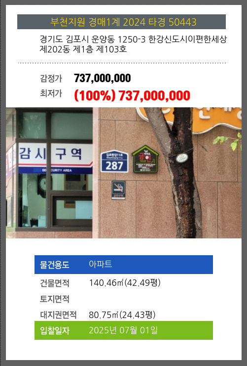 사건번호 2024 타경 50443 본건은 경기도 김포시 운양동 1250-3 한강신도시이편한세상 제202동 제1층 제103호소재하는 아파트경매 물건의 포스팅입니다. 건물면적 [ 140.46㎡ (42.49평) ]대지권 [ 80.75㎡ (24.43평) ]