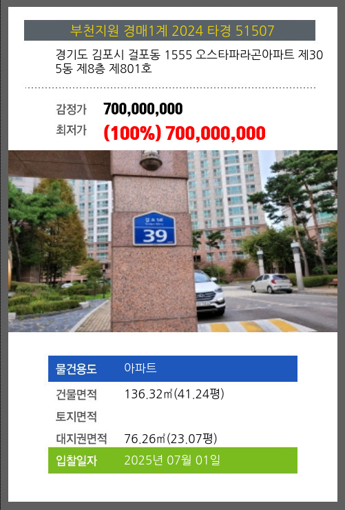 사건번호 2024 타경 51507 본건은 경기도 김포시 걸포동 1555 오스타파라곤아파트 제305동 제8층 제801호소재하는 아파트경매 물건의 포스팅입니다. 건물면적 [ 136.32㎡ (41.24평) ]대지권 [ 76.26㎡ (23.07평) ]