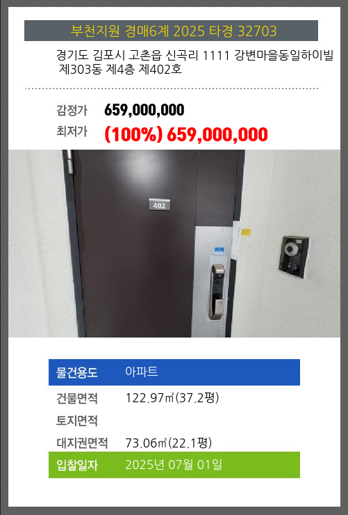 사건번호 2025 타경 32703 본건은 경기도 김포시 고촌읍 신곡리 1111 강변마을동일하이빌 제303동 제4층 제402호소재하는 아파트경매 물건의 포스팅입니다. 건물면적 [ 122.97㎡ (37.2평) ]대지권 [ 73.06㎡ (22.1평)
