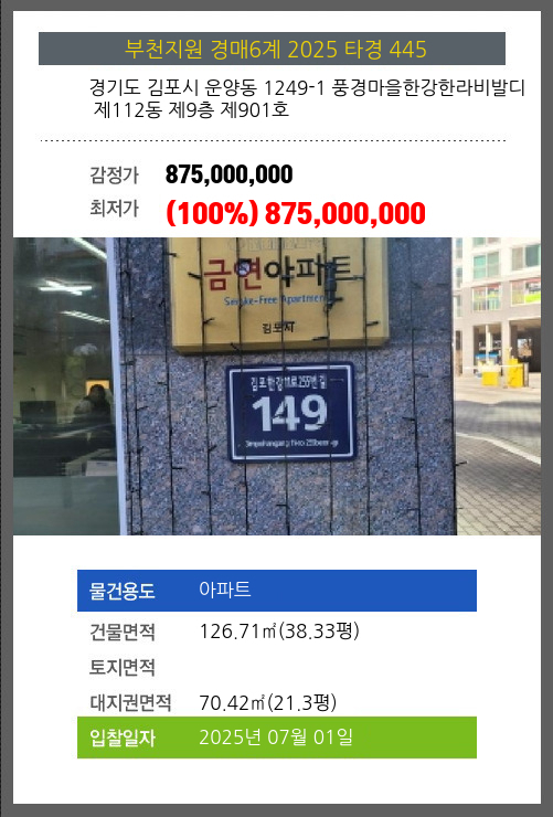 사건번호 2025 타경 445 본건은 경기도 김포시 운양동 1249-1 풍경마을한강한라비발디 제112동 제9층 제901호소재하는 아파트경매 물건의 포스팅입니다. 건물면적 [ 126.71㎡ (38.33평) ]대지권 [ 70.42㎡ (21.3평) ]