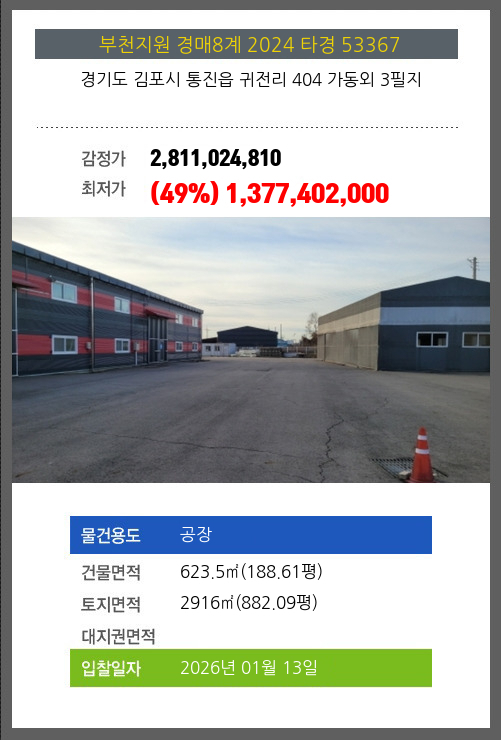 사건번호 2024 타경 53367 본건은 경기도 김포시 통진읍 귀전리 404 가동외 3필지소재하는 공장경매 물건의 포스팅입니다. 건물면적 [ 623.5㎡ (188.61평) ]토지면적 [ 2916㎡ (882.09평) ] 시세를