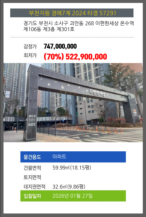사건번호 2024 타경 57291 본건은 경기도 부천시 소사구 괴안동 268 이편한세상 온수역 제106동 제3층 제301호소재하는 아파트경매 물건의 포스팅입니다. 건물면적 [ 59.99㎡ (18.15평) ]대지권 [ 32.6㎡