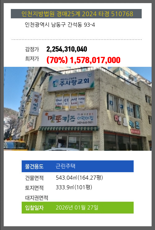 사건번호 2024 타경 510768 본건은 인천광역시 남동구 간석동 93-4소재하는 근린주택경매 물건의 포스팅입니다. 건물면적 [ 543.04㎡ (164.27평) ]토지면적 [ 333.9㎡ (101평) ] 시세를 반영한 감정가 2,254,310,040에서1회