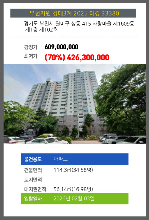 사건번호 2025 타경 33380 본건은 경기도 부천시 원미구 상동 415 사랑마을 제1609동 제1층 제102호소재하는 아파트경매 물건의 포스팅입니다. 건물면적 [ 114.3㎡ (34.58평) ]대지권 [ 56.14㎡ (16.98평)