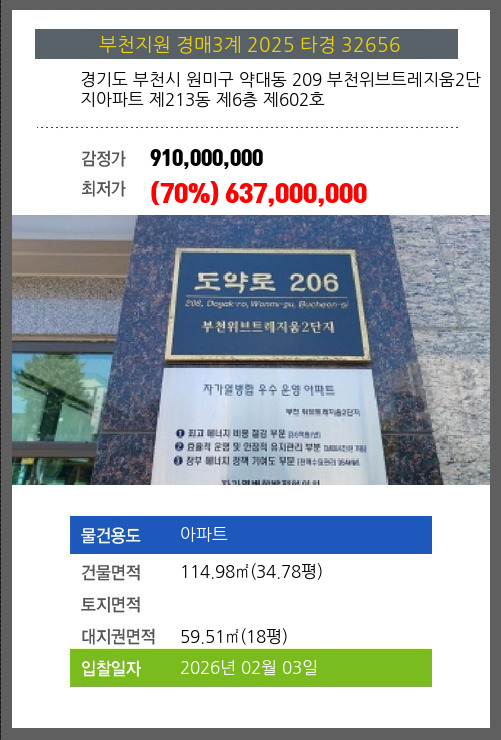 사건번호 2025 타경 32656 본건은 경기도 부천시 원미구 약대동 209 부천위브트레지움2단지아파트 제213동 제6층 제602호소재하는 아파트경매 물건의 포스팅입니다. 건물면적 [ 114.98㎡ (34.78평) ]대지권 [ 59.51㎡ (18평)