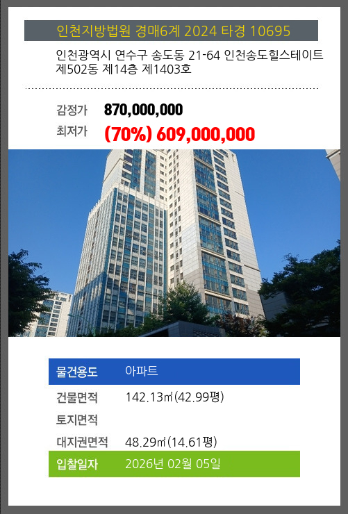 사건번호 2024 타경 10695 본건은 인천광역시 연수구 송도동 21-64 인천송도힐스테이트 제502동 제14층 제1403호소재하는 아파트경매 물건의 포스팅입니다. 건물면적 [ 142.13㎡ (42.99평) ]대지권 [ 48.29㎡ (14.61평) ]