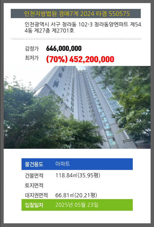 사건번호 2024 타경 550575 본건은 인천광역시 서구 청라동 102-3 청라동양엔파트 제544동 제27층 제2701호소재하는 아파트경매 물건의 포스팅입니다. 건물면적 [ 118.84㎡ (35.95평) ]대지권 [ 66.81㎡ (20.21평) ]