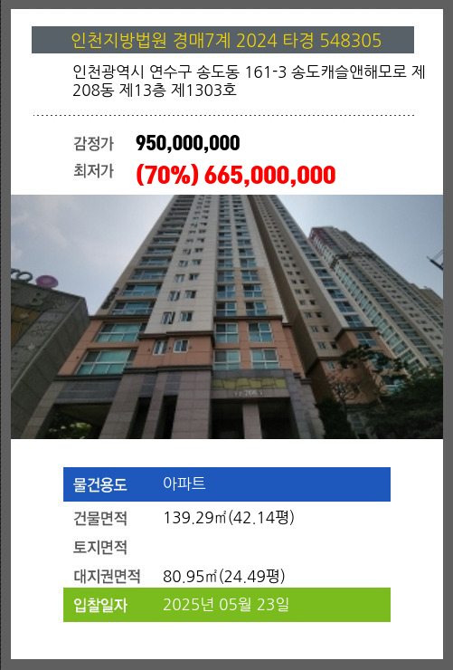 사건번호 2024 타경 548305 본건은 인천광역시 연수구 송도동 161-3 송도캐슬앤해모로 제208동 제13층 제1303호소재하는 아파트경매 물건의 포스팅입니다. 건물면적 [ 139.29㎡ (42.14평) ]대지권 [ 80.95㎡ (24.49평) ]