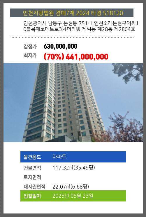 사건번호 2024 타경 518120 본건은 인천광역시 남동구 논현동 751-1 인천소래논현구역씨10블록에코메트로3차더타워 제씨동 제28층 제2804호소재하는 아파트경매 물건의 포스팅입니다. 건물면적 [ 117.32㎡ (35.49평) ]대지권 [ 22.07㎡ (6.68평) ]