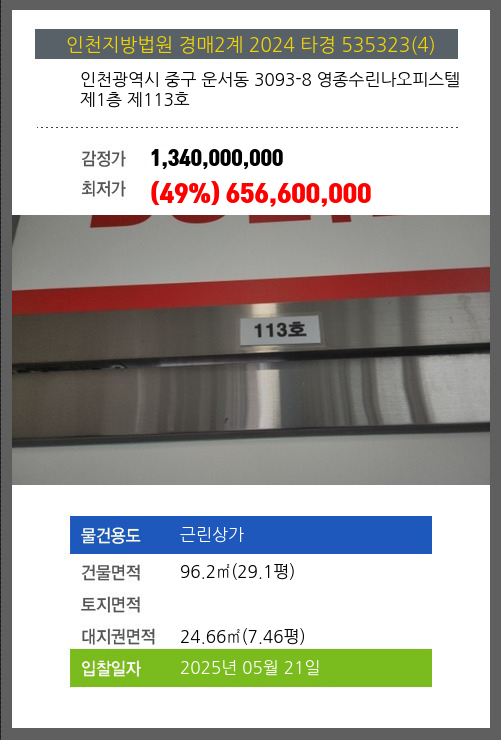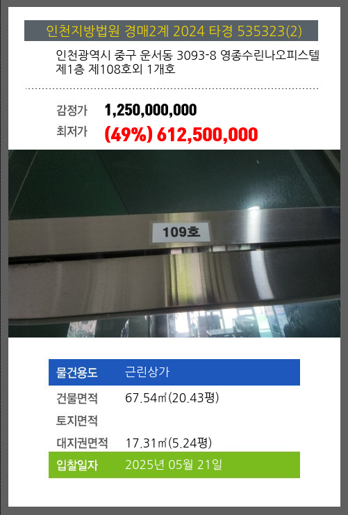 사건번호 2024 타경 535323(2) 본건은 인천광역시 중구 운서동 3093-8 영종수린나오피스텔 제1층 제108호외 1개호소재하는 근린상가경매 물건의 포스팅입니다. 건물면적 [ 67.54㎡ (20.43평) ]대지권 [ 17.31㎡ (5.24평) ]