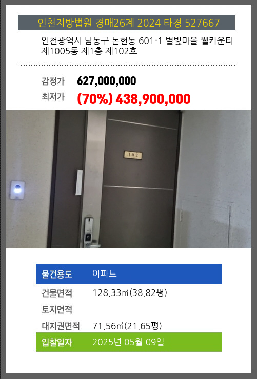 사건번호 2024 타경 527667 본건은 인천광역시 남동구 논현동 601-1 별빛마을 웰카운티 제1005동 제1층 제102호소재하는 아파트경매 물건의 포스팅입니다. 건물면적 [ 128.33㎡ (38.82평) ]대지권 [ 71.56㎡ (21.65평)