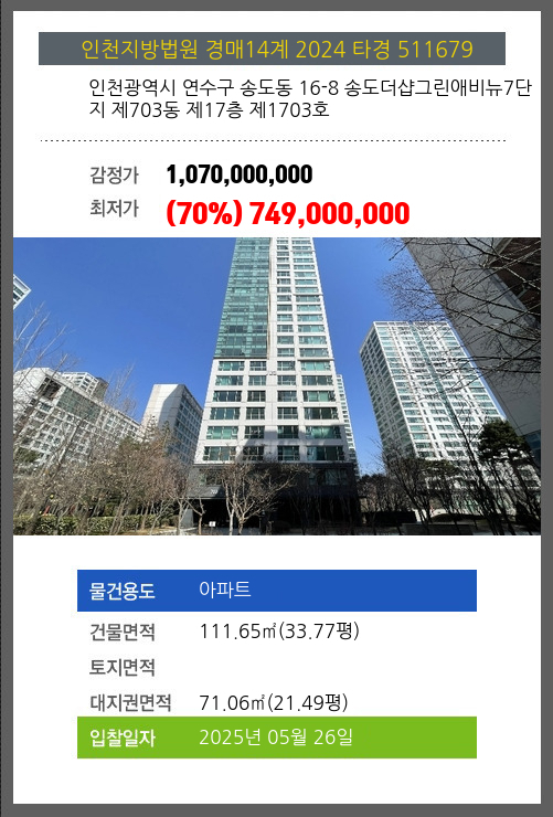 사건번호 2024 타경 511679 본건은 인천광역시 연수구 송도동 16-8 송도더샵그린애비뉴7단지 제703동 제17층 제1703호소재하는 아파트경매 물건의 포스팅입니다. 건물면적 [ 111.65㎡ (33.77평) ]대지권 [ 71.06㎡ (21.49평) ]