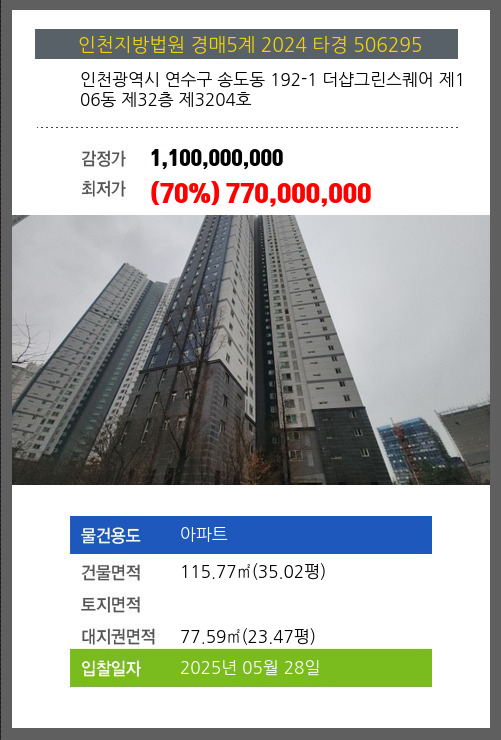 사건번호 2024 타경 506295 본건은 인천광역시 연수구 송도동 192-1 더샵그린스퀘어 제106동 제32층 제3204호소재하는 아파트경매 물건의 포스팅입니다. 건물면적 [ 115.77㎡ (35.02평) ]대지권 [ 77.59㎡ (23.47평) ]