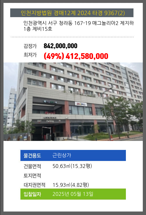 사건번호 2024 타경 9367(1) 본건은 인천광역시 서구 청라동 167-19 매그놀리아2 제지하1층 제비13호외 1개호소재하는 근린상가경매 물건의 포스팅입니다. 건물면적 [ 101.26㎡ (30.63평) ]대지권 [ 31.86㎡ (9.64평) ]