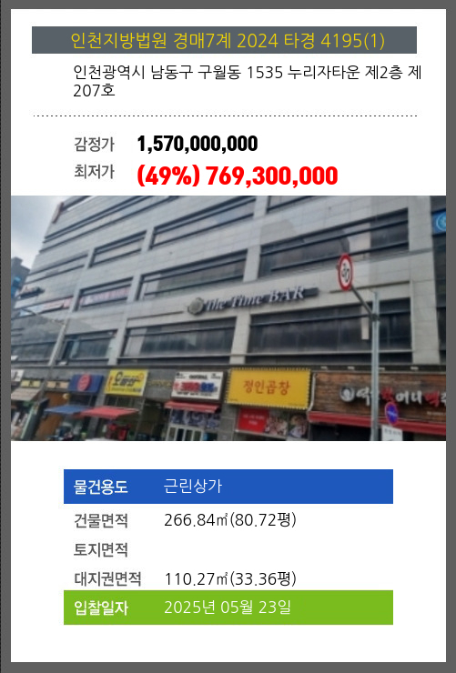 사건번호 2024 타경 4195(1) 본건은 인천광역시 남동구 구월동 1535 누리자타운 제2층 제207호소재하는 근린상가경매 물건의 포스팅입니다. 건물면적 [ 266.84㎡ (80.72평) ]대지권 [ 110.27㎡ (33.36평) ] 시세를