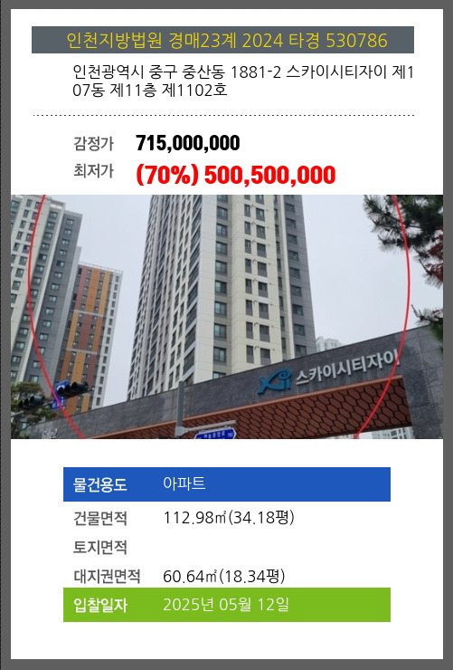사건번호 2024 타경 530786 본건은 인천광역시 중구 중산동 1881-2 스카이시티자이 제107동 제11층 제1102호소재하는 아파트경매 물건의 포스팅입니다. 건물면적 [ 112.98㎡ (34.18평) ]대지권 [ 60.64㎡ (18.34평) ]