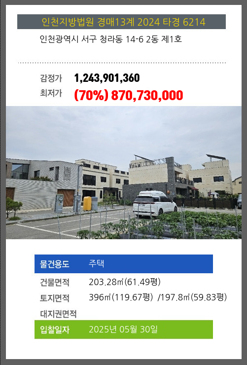 사건번호 2024 타경 6214 본건은 인천광역시 서구 청라동 14-6 2동 제1호소재하는 주택경매 물건의 포스팅입니다. 건물면적 [ 203.28㎡ (61.49평) ]토지면적 [ 전체:396㎡ (119.67평) 매각지분:197.8㎡ (59.83평) ]
