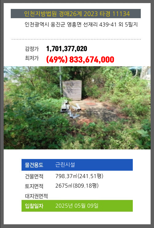 사건번호 2023 타경 11134 본건은 인천광역시 옹진군 영흥면 선재리 439-41 외 5필지소재하는 근린시설경매 물건의 포스팅입니다. 건물면적 [ 798.37㎡ (241.51평) ]토지면적 [ 2675㎡ (809.18평) ] 시세를