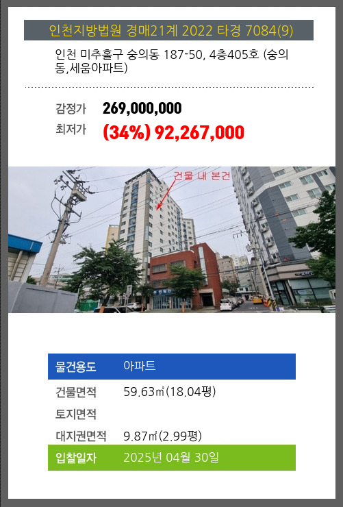 사건번호 2022 타경 7084(9) 본건은 인천 미추홀구 숭의동 187-50, 4층405호 (숭의동,세움아파트)소재하는 아파트경매 물건의 포스팅입니다. 건물면적 [ 59.63㎡ (18.04평) ]대지권 [ 9.87㎡ (2.99평) ] 시세를 반영한