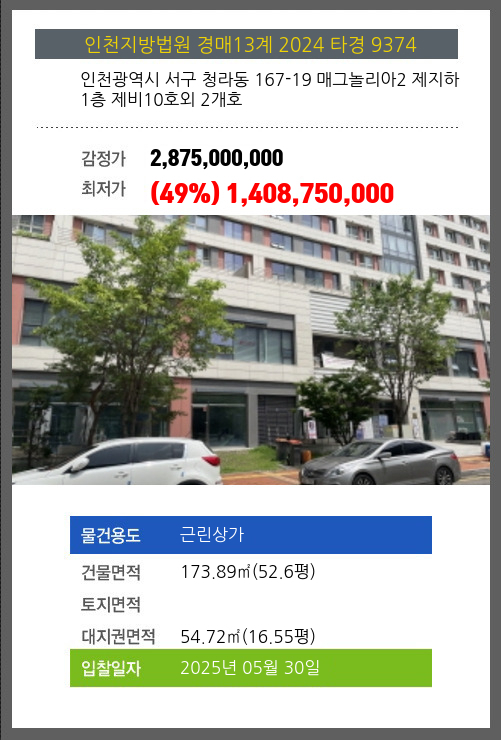 사건번호 2024 타경 9374 본건은 인천광역시 서구 청라동 167-19 매그놀리아2 제지하1층 제비10호외 2개호소재하는 근린상가경매 물건의 포스팅입니다. 건물면적 [ 173.89㎡ (52.6평) ]대지권 [ 54.72㎡ (16.55평) ]